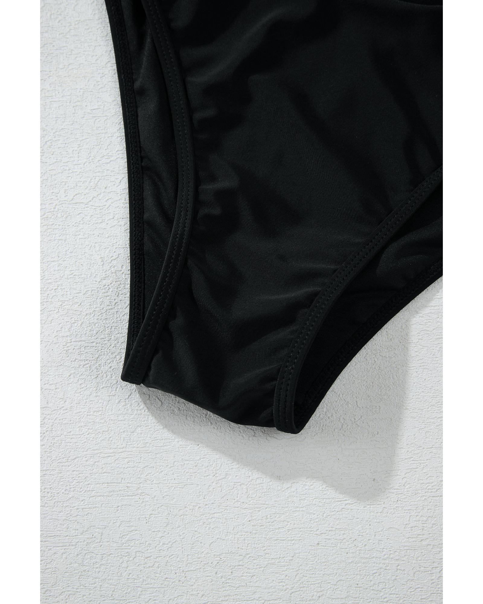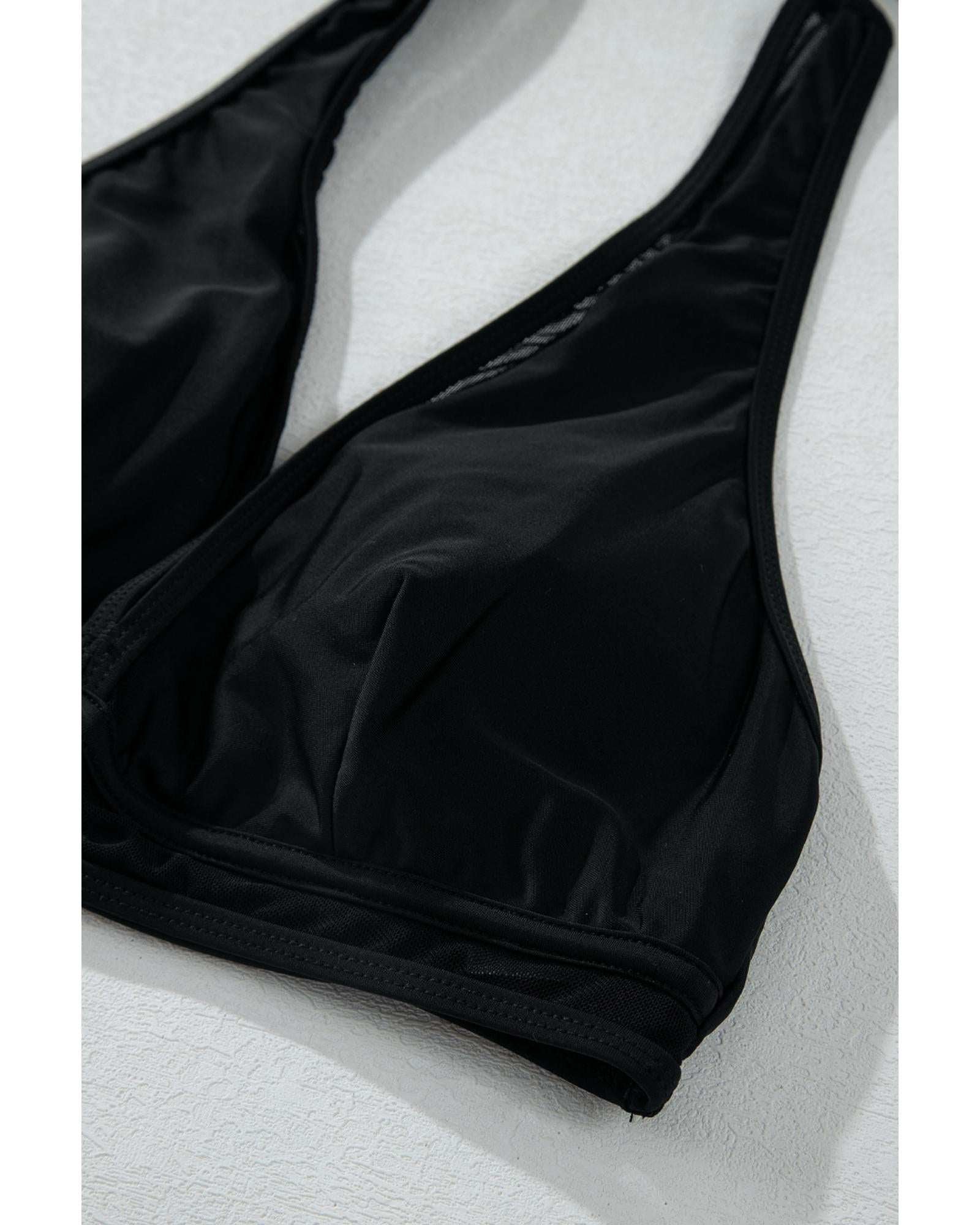 Black Sheer Mesh Edged Halter V Neck Push Up Bikini - XL