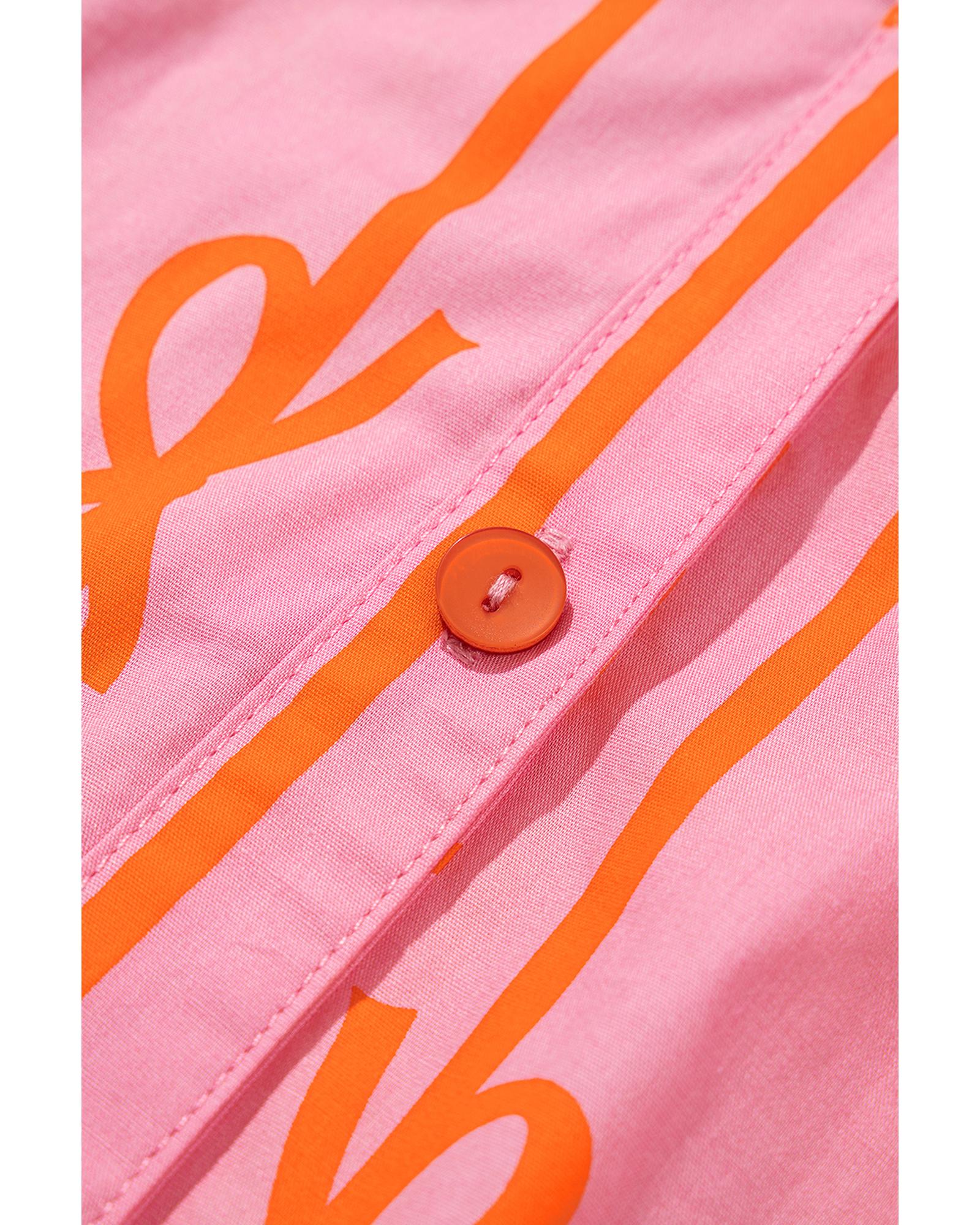 Pink Bowknot Striped Printed Bubble Sleeve Buttoned Belted Mini Dress